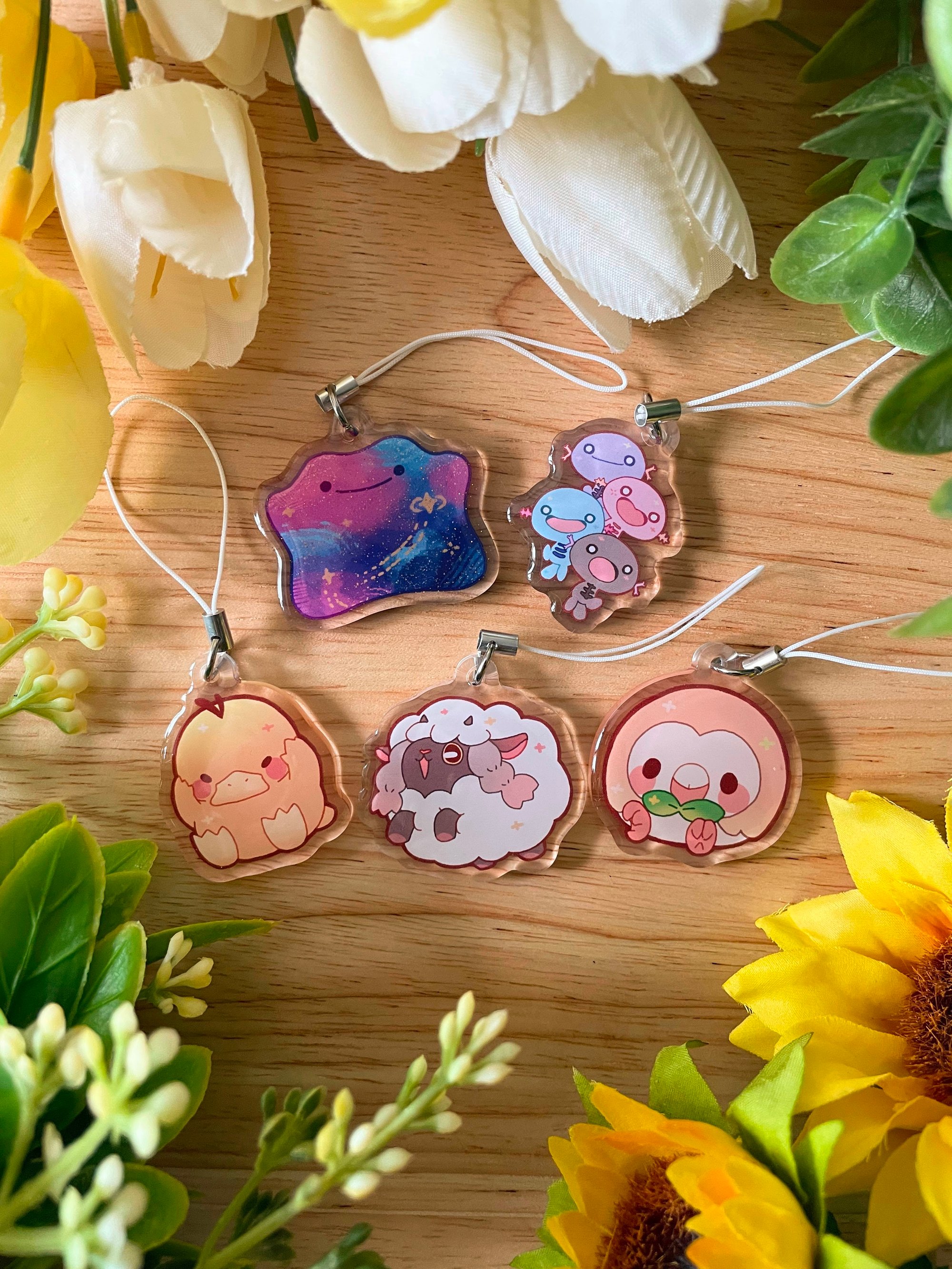 1.5 inch double-sided epoxy resin mini charms of various Pokemon. Space Ditto charm has a sparkly glitter effect.