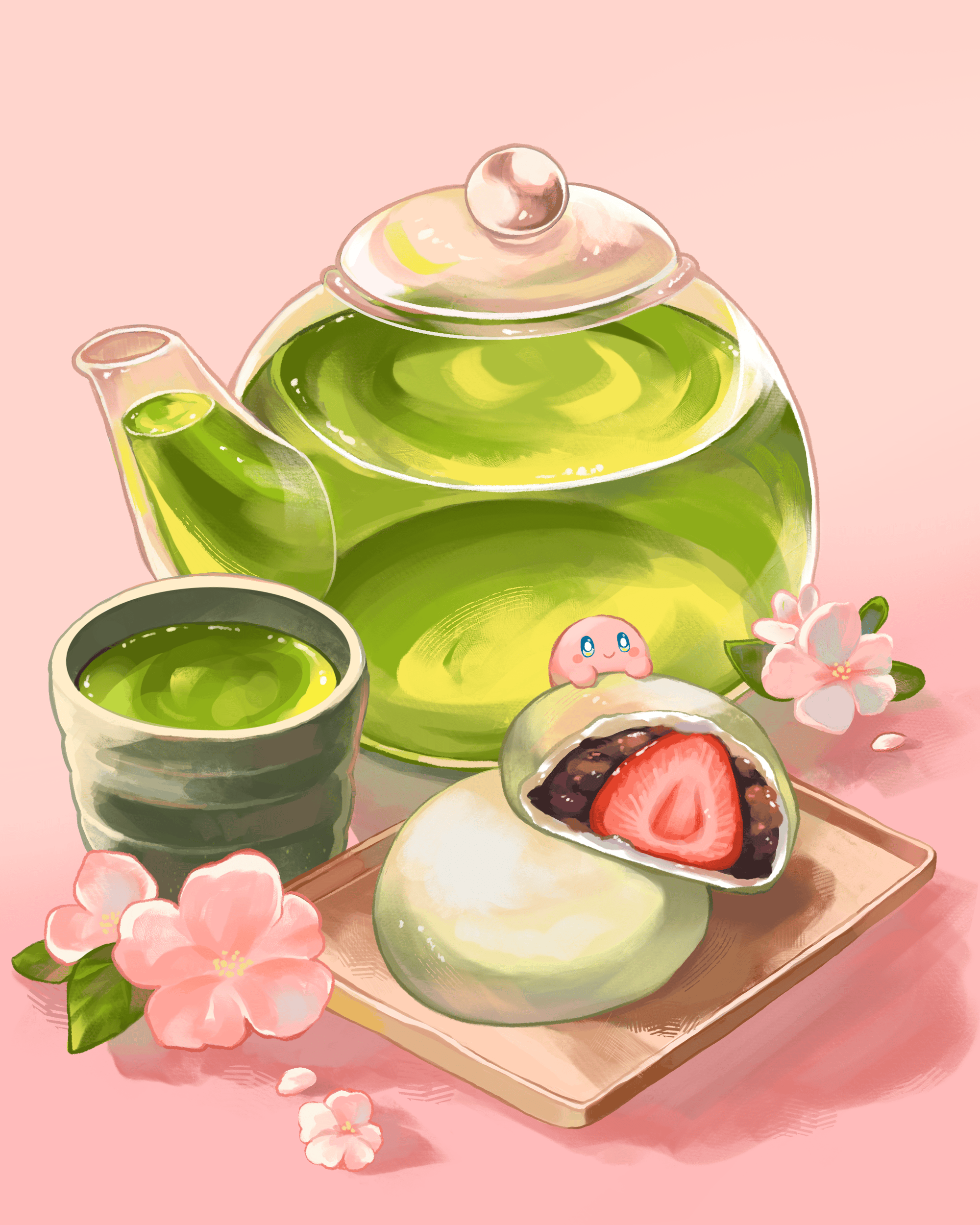 8x10 inch print of Kirby and a Japanese sweet (ichigo daifuku) with green tea.